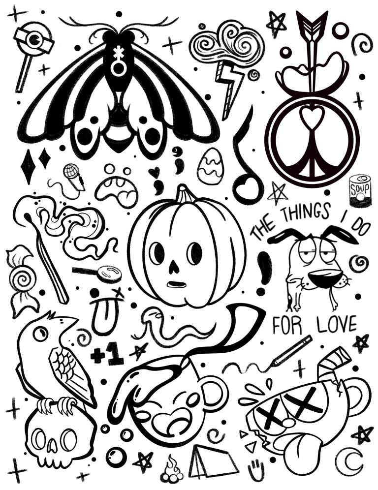 This tattoo flash-sheet features a mix of pop art and unique designs. All designs are available for tattoo commission